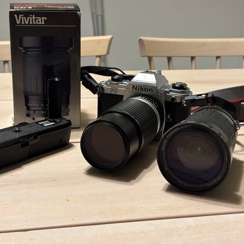 Järjestelmäkamera Nikon 601 ja objektiivi+varusteita
