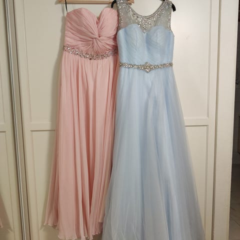Viininpunainen mekko. Yläosa pitsiä ja strasseja. Helmassa alin kerros satiinia ja muut kerrokset tylliä.