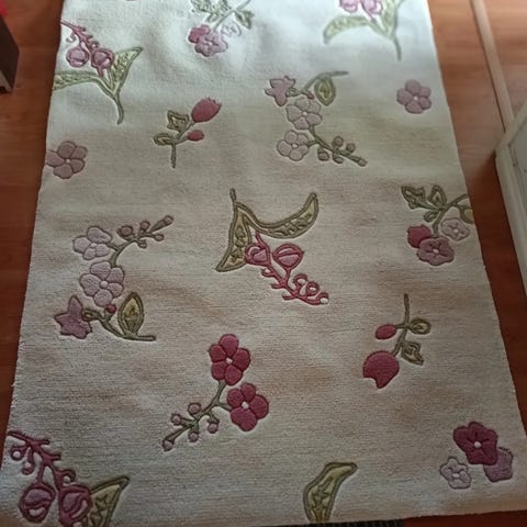 Harmaansininen pitkä matto, merkki Marimekko. Pesty, pari korjattavaa kohtaa. Koko 246 x 82 cm.