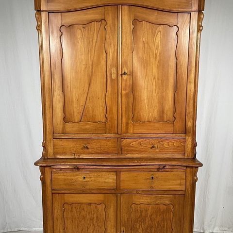 Tuotetiedot: 1800-luvulla Närpiön kirkkoherran K.I.Nordlundin perheen käytössä ollut ainutlaatuinen kaappi. Kaappi on kaksiosainen. Alaosassa on neljä vetolaatikkoa ja yläosassa kaksi kiinteää hyllyä. Kaapin yläosan lukko toimii. Yksi avain tulee mukana. Yläosan kahdessa pienessä lasi-ikkunassa on halkeamat, joten tilasimme uudet lasit, mutta vaihdamme ne vasta oston yhteydessä ostajan halutessa (emme halunneet vaihtaa heti, kun kyseessä ovat alkuperäiset lasit).