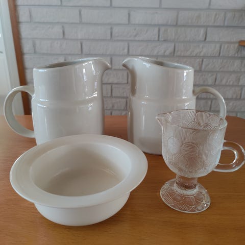 Lisätiedot: Tarjoilulautasen halkaisija 25 senttiä, pullalautasten 16 senttiä