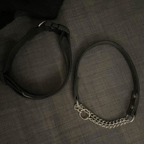 Flexi, musta ja sininen, ja pieni kaulapanta