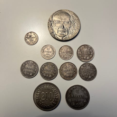 Rahasarjat, joissa kolikot 1p, 5p, 10p, 20p, 50p, 1mk ja 5mk