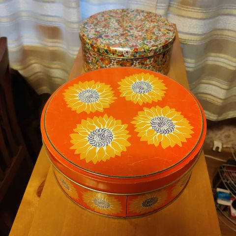 Vanha peltipurkki, sisäosa kunnossa. Kannessa pari pientä viiltoa.