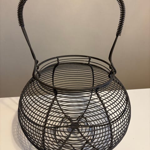 Kanamainen kori kananmunille, valkoiseen posliiniosaan mahtuu vielä 7 munaa.