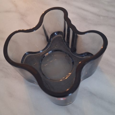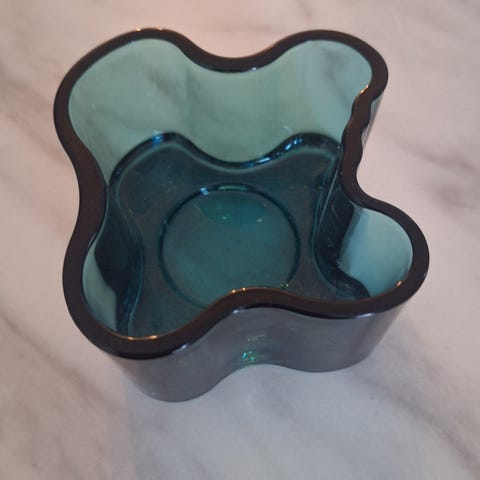 Iittalan Aalto -kynttilälyhty värissä merensininen. Ei ole käytetty, mutta tarra irronnut käsitiskissä kun pesty pölyjä. Iittala ei myy enää kyseistä väriä.