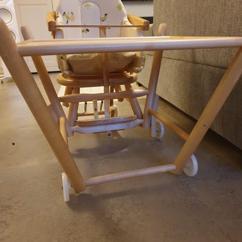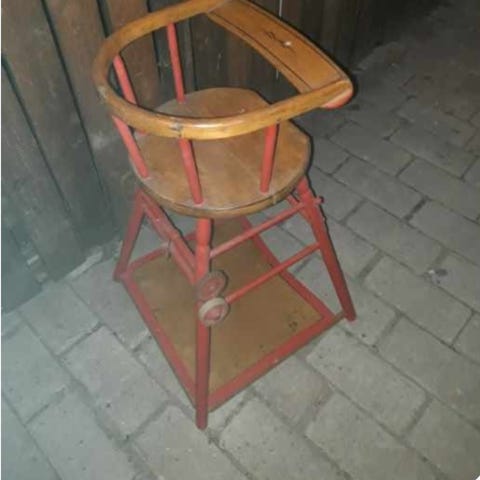 Retro, retrompi, retroin... Unohda Tripp Trapp ja hanki lapselle hieman komeampi syöttötuoli! Erittäin tyylikäs lasten syöttötuoli suoraan 1970-luvulta vailla uutta kotia. Tuolin runko valkoiseksi maalattua teräsputkea, kevyesti pehmustetut siniset istuinosa ja selkänoja. Kunto on ehjä ja metallirakenteen ansiosta tukeva. Maalipinnoissa on jonkin verran kolhuja ja jaloista puuttuu lattiaa suojaavat muoviset holkit. Holkkeja saa edelleen rautakaupasta, mutta hyvin toimii ilmankin. Syöttötuolin mitat ovat: