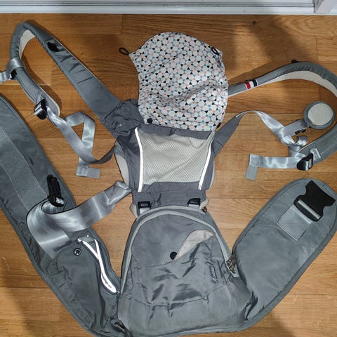 Myydään lahjana saatu ehjä ja hyväkuntoinen Treppy-kantoväline, joka muuntautuu lantiokantoistuimeksi. Ylä- ja alaosaa yhdessä käyttämällä saa aikaan kantorepun. En käyttäisi ainoastaan pelkkää yläosaa, koska jalat eivät silloin ole ergonomisessa M-asennossa, joka mahdollistaa terveen lonkkien ja selkärangan kehityksen. Muuten turvallisen ja kestävän oloinen. Vyössä ja etupaneelissa vetoketjutaskut. Kantotuen sisällä olevaa koviketta lukuunottamatta pesty juuri 60°.