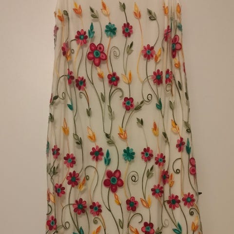 Uusi kaunis mekko, lappu vielä kiinni. Koko UK12, vastaa kokoa 38. Niskan taakse solmittava malli. Edessä rusetti. Kankaassa kauniit kirkkaat kukka- ja palmukuviot. Alareunassa läpinäkyvä tylliosio.
