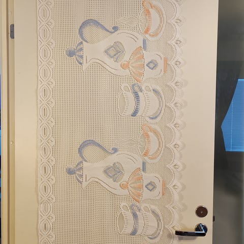 Puuvillainen kappaverho 294 x 55 cm. Ompelijan ompelema, tehty kolmesta metrin kappaleesta, saumoja ei ole kohdistettu. Ollut käytössä mutta värit eivät ole haalistuneet.
