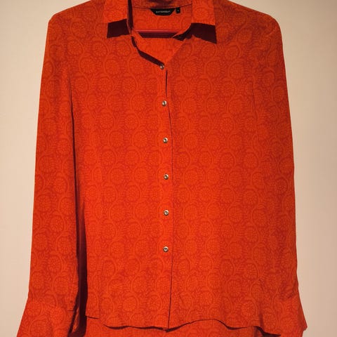 Kuin uusi 100% silkkipaita. Pyöristetty helma. Kaunis kuosi.