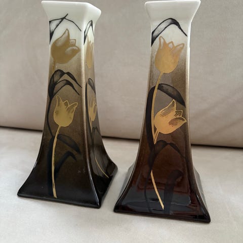 Heljä Liukko-Sundströmin Arabialle suunnittelemat käsinmaalatut ruskeat kynttilänjalat, jotka olivat tuotannossa 1980-luvulla.