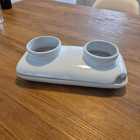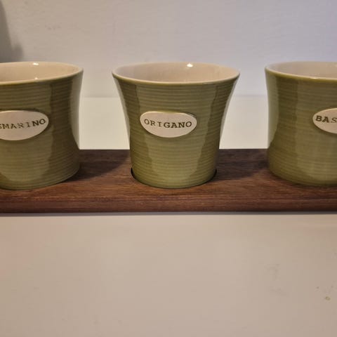 Myydään hyväkuntoiset kuvien mukaiset Sagaformin yrttiruukut (3 kpl) ja niiden puinen alusta. Alustassa toisessa reunassa muutama pieni "halkeama" (merkitty kuvaan). Yhdessä ruukussa (origano) on sisäpinnalla lasitteessa muutama pintahalkeama (krakelloituminen ?), näkyy viimeisessä kuvassa.