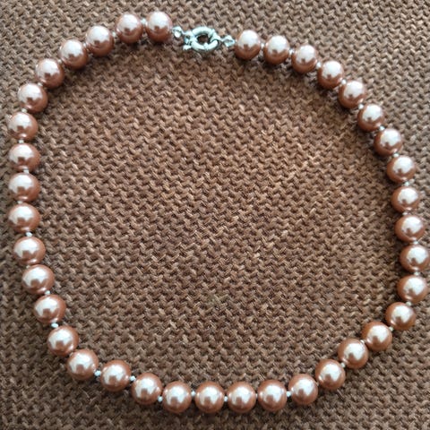 Joskus lahjaksi saatu helminauha samettirasialla. Ovat mielestäni ei-aidot helmet, silti laadukkaat muovihelmet. Lukko kirurginterästä. Ympärysmitta 42 cm.
