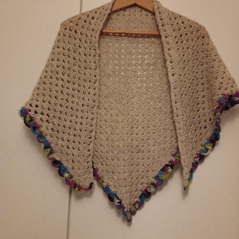 Käsin tehty hartiahuivi. Pitkä sivu n. 145cm, kärjestä pitkään sivuun n. 70cm.