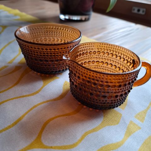Vanhaa mallistoa oleva Kastehelmi kermakko ja sokerikko turkoosin värisenä. Tarkemmin katsottuna huomaa pienen väri eron. Sokerikossa pieni kolhu reunassa, kermakko hyvässä kunnossa.