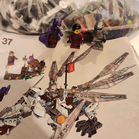 Osat, ohjeet ja laatikko. Sinisen ukkelin vartalo korvattu vastaavan värisellä, hieman erilaisella vartalolla.