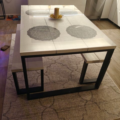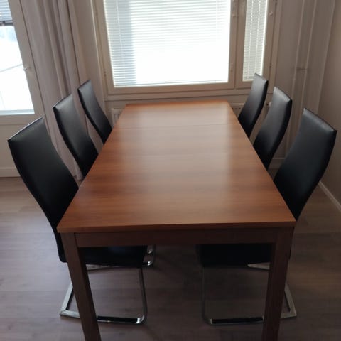 Perinteikäs valkoinen ruokailuryhmä. Pöydän kansi sekä tuolien istuimet MDF-levy. Jalat ja rungot koivua niin tuoleissa kuin pöydässä.