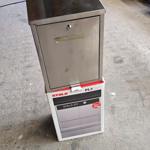 Kuvan postilaatikko, ei avainta. Luukku sen verran leveä, että ainakin kapea käsi mahtuu ottamaan postit. Tai sitten spaghetti-pinseteillä. :-)
