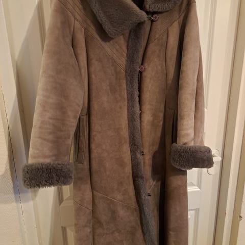 Upean sävyinen, näyttävä, suoran mallinen laadukas aito turkki kelsiturkki kelsitakki turkkitakki lampaanvillaa/turkista, tummanruskealla aidolla turkiskauluksella(arviolta minkkiä).