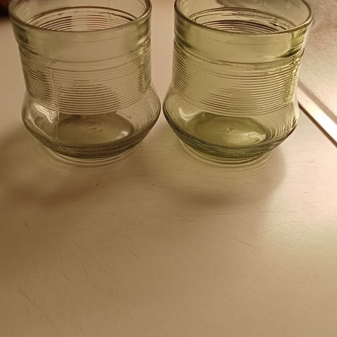Labyrintti-laseja 2 kpl, ehjät. Vanhat sinappilasit. Riihimäen lasi.