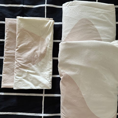 Muutoin hyvässä kunnossa olevat 2 pussilakanaa ja 4 tyynyliinaa.
