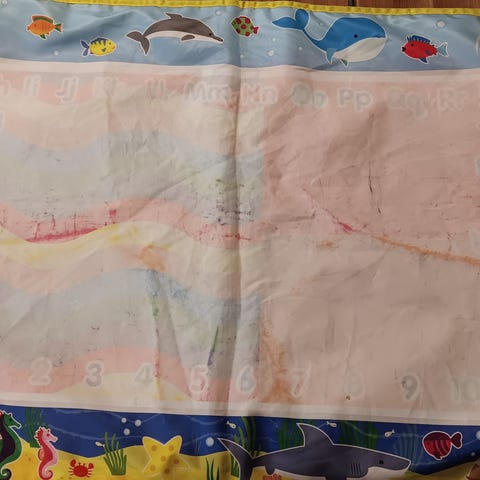 Valkoinen lasten leikki/sisustusmatto. Valkoisessa osassa jotain mustia tahroja, lähtee varmaan tahranpoistolla.