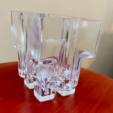 Myydään Riihimäen Lasin valmistama, Helena Tynellin suunnittelema Paalutalo maljakko. Korkeus n. 12cm, leveys n. 10cm, paino 870g. Yksi pieni lohkeama (kuva 3) ja muutama "kirpun purema" maljakossa (kuva 4).