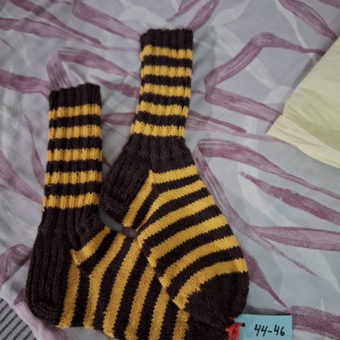 Villalangasta kinnasneulalla ommellut kintaat. Langan vyötteet ei tallessa. Miesten koko, lev. peukalon alta 12 cm, koko kintaan pituus 24 cm. Kåyttämättömät. Nouto tai postitus XXS paketti 6,90€.