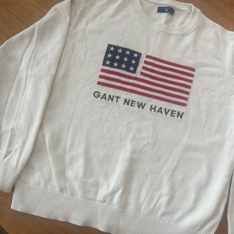 Valkoinen Gant kesäpaita sinisillä kirjauksille pääntrissä ja hihansuissa. Materiaali 97% puuvillaa ja 3% elastaania. Siistissä kunnossa. Koko on 170cm. Mitat: kai-kai 48cm, olka-helma 60cm.