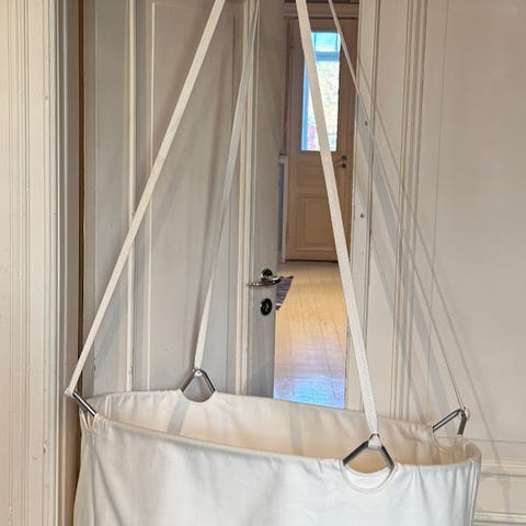 Hienossa kunnossa oleva Leander roikkuva kehto jossa vauvan saa mukavasti tuuditettua unille. Voi roikottaa suoraan katostakin, mutta tässä paketissa tukeva valkoinen puinen teetetty teline roikotusta varten. Teline taittuu kuljetusta varten kasaan.