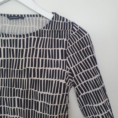 Koko xs, menee myös s-kokoiselle. Takapuolella väri hieman lähtenyt/jostain ilmestynyt haaleita valkoisia pilkkuja (katso viimeinen kuva). Ei ole haitannut omaa silmää. Muuten hyväkuntoinen.