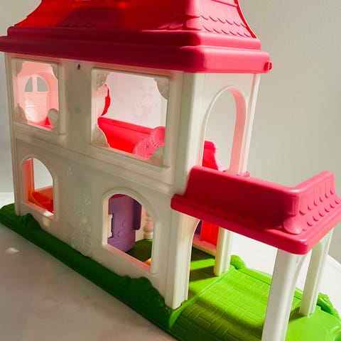 Hyväkuntoinen Fisher-Pricen avautuva retro leikkitalo.