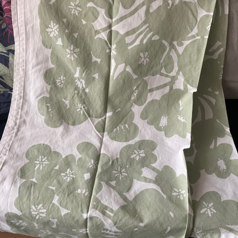 Myydään sinisellä pohjalla oleva kukallinen pöytäliina. Tahra pöytäliinassa näkyy kuvassa