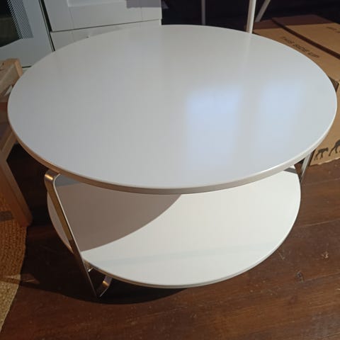Valkoinen pyöreä sohvapöytä. Halkaisija 80cm.Tukeva pöytä metallijaloilla. Kaksi tasoa. Pieni nirhama pinnassa. Vain nouto. Ei tori diiliä.