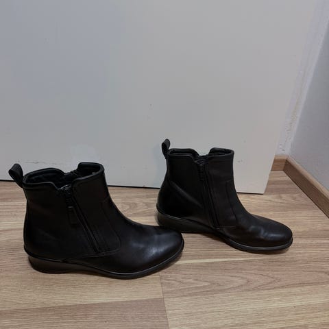 Ecco merkkiset naisten nahkasaappaat kokoa 38. Vähällä käytöllä olleet. Toisen kengän kannassa pieni jälki, näkyy viimeisessä kuvassa. Mukaan saa saapastuet.