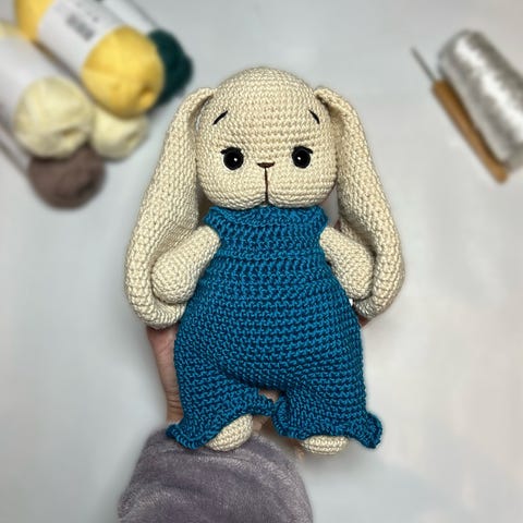 Sisällä vanua, muoviset silmät jonka takia ei suositella alle kolmevuotiaille. Pehmeästä langasta virkattu.