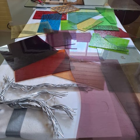Kuvien vanhat palat, luonnonvalkoista, kermansävyä ja vihreää,vaaleanpunaisen valkoinen tuo yläreunan pala+ pikkupaloja joilla ei rahallista arvoa.