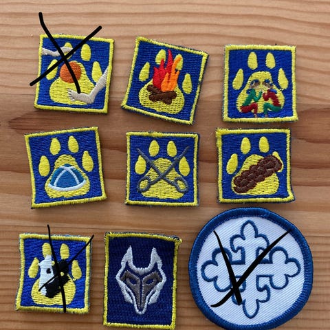 Kuvan partiomerkit, yhteensä 6kpl. Ylimääräiseksi jääneet, ei enää harrasteta.