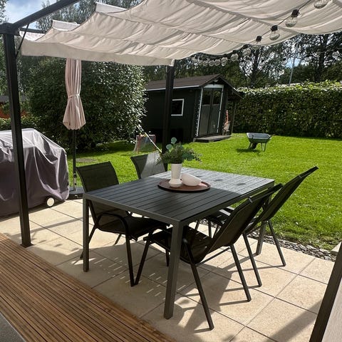 Myymälän esittelykäytöstä Praticin pergola free. Koko 4 x 3m, korkeus 2,6m. Laskostuvan vaalean harmaa katto avataan ja suljetaan kaukosäätimellä. Led valaistus, pylväsvalot, pistorasia ja USB liitäntä. Nähtävissä Tampereella, Nuutisarankatu 35