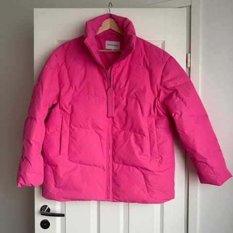 Takin täyte on kierrätettyä untuvaa. Takissa on korkea kaulus ja edessä metallivetoketju, jossa on brodeerattu Marimekko-logollinen vedin. Listataskuissa on piilopainonapit ja helmassa on kiristysnyöri.