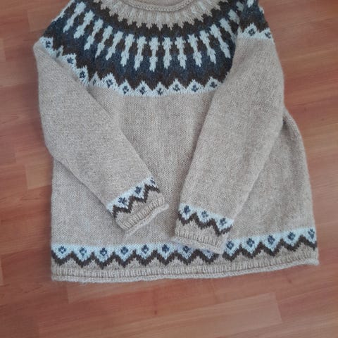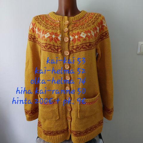Uusi, itse tehty villatakki islantilaisesta kaksinkertaisesta Plötulopi-langasta. Väreinä golfvirta ja norsunluunbeige. Paksu ja lämmin. Viimeistelypesu tehty. M-kokoisen neuleen silmukkamäärä.