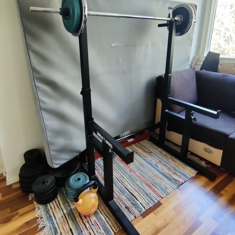 Itse tehty ja saatannan jämerä. Telineeseen kuuluu säädettävät turvakaiteet.