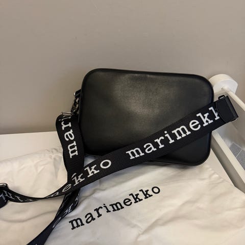 Marimekko Gratha. Mustaa nahkaa. Kuvissa näkyy vähäiset kulumat, kun kirkkaassa valossa kallistaa oikein ja ottaa ”worst-case” tilanteesta kuvan. Eli luonnossa vielä siistimmän näköinen, todennäköisesti pieni sipaisu nahanhoitoainetta hävittä nuo pinnalliset jäljet.