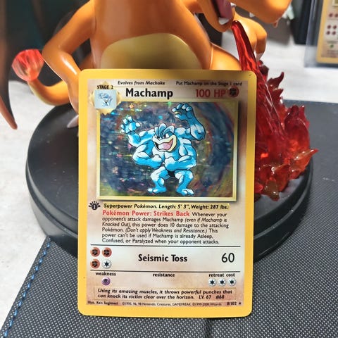 Hyvässä kunnossa oleva Machamp Vmax kortti säilytetty Pokémon keräilykirjassa.👍 Full art ihan vähän kulunut reunoilta