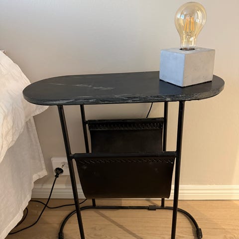 Sivupöytä esimerkiksi partsille. Pöydän pinta on painavaa kiveä. Yhdessä kohtaa pintaa pieni naarmu