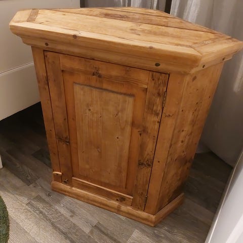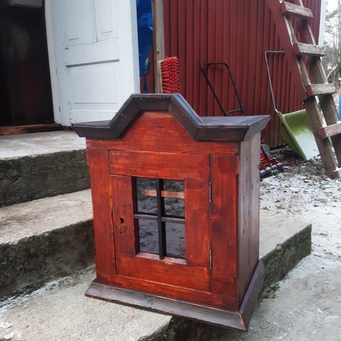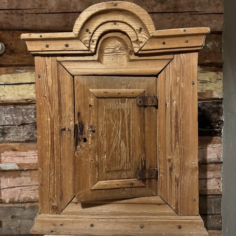 Upea renginkaappi / seinäkaappi arviolta 1940 luvulta. Ei avainta, mutta lukko auki asennossa ja ylhäältä tehty reikä jolla kaapin saa lukittua tapilla.