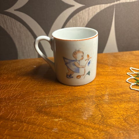 Arabian lasten muki poika-aiheisilla kuvioilla. Piippuleima 1932-1949. Halkaisija vajaat 7 cm, korkeus 8 cm.