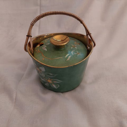 Väri on tummanruskea. Purkki on ehjä, samoin rottinkikahva. Suuaukon reunassa näkyy kahvan kiinnityskohdan lähellä kuluma / värivirhe, kts. viimeinen kuva. Kansi puuttuu.