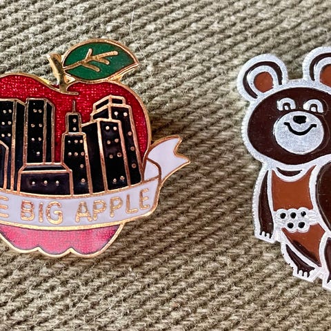3 kpl Mischa-karhu pinssejä vuodelta -80. 2 kpl värillinen ja väritön.